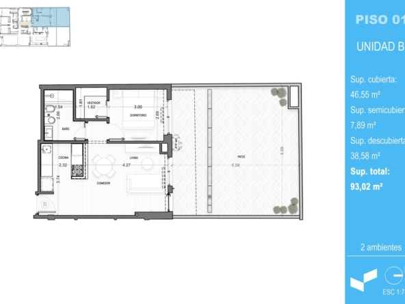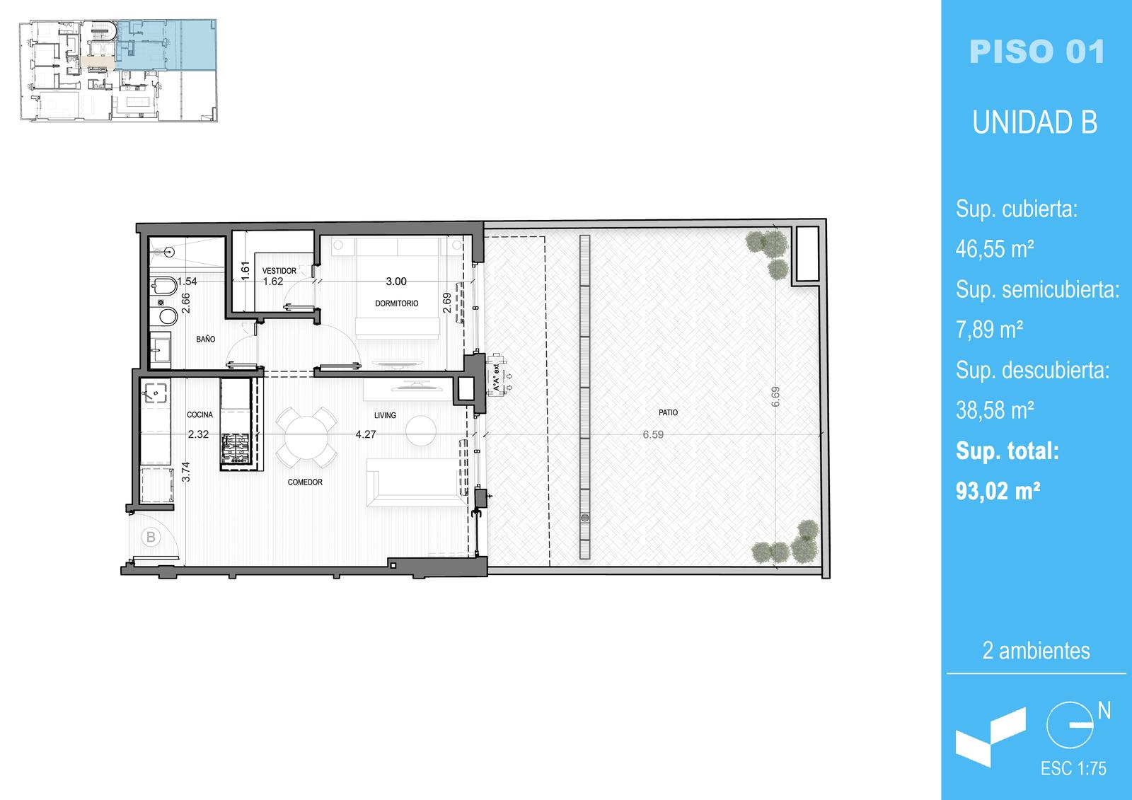 Encantador 2 ambientes con amplio patio privado y acceso desde todos los ambientes. Habitación en suite con vestidor, placares espejados y living comedor con cocina integrada.
