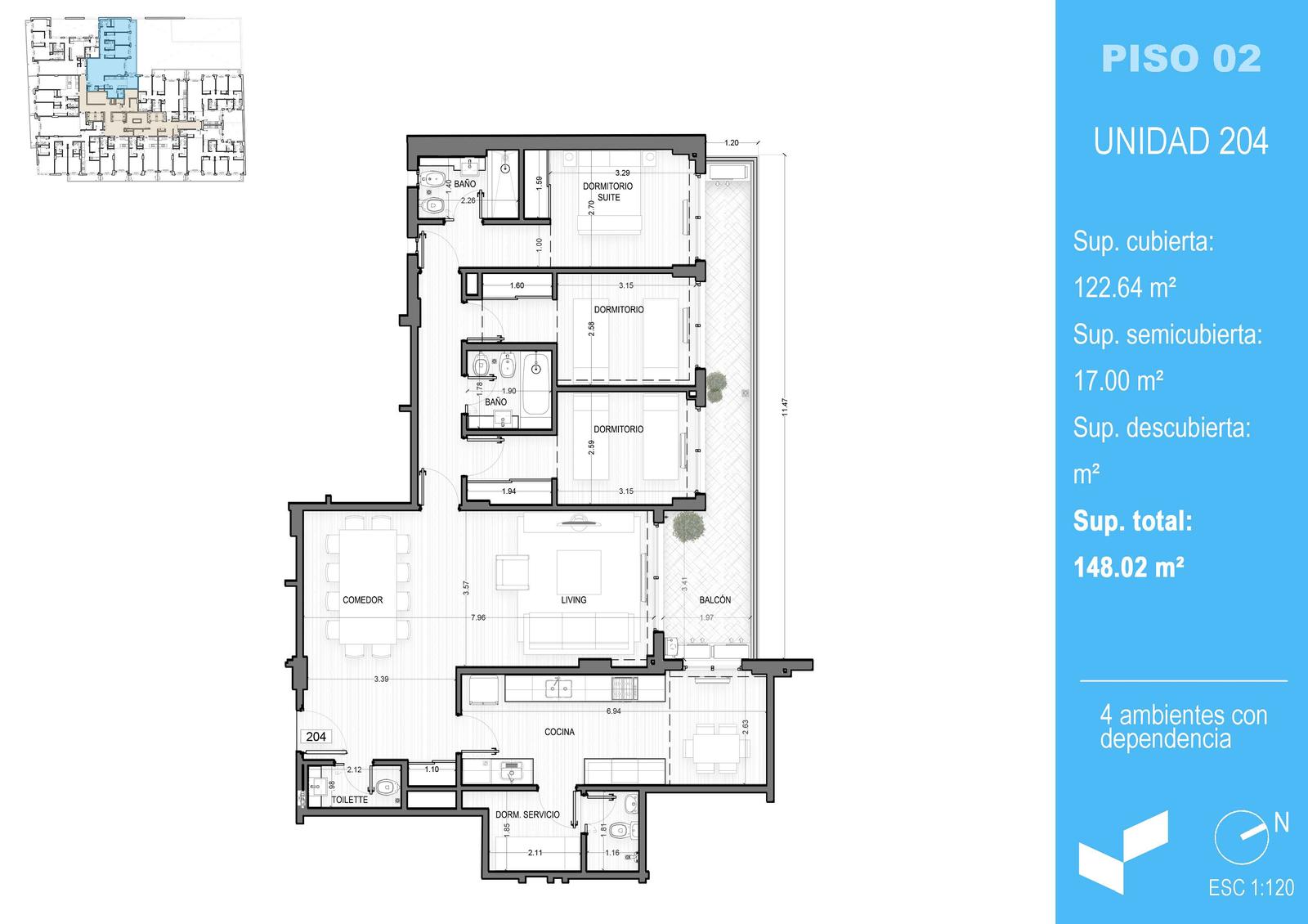 Amplio 4 ambientes con balcón al contrafrente. Habitación principal en suite, placares espejados, comedor diario, cocina separada, toilette y dependencia con baño.