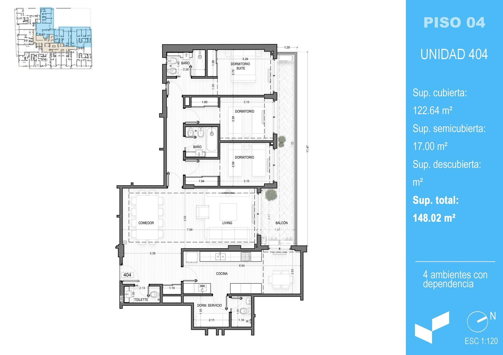 Amplio 4 ambientes con balcón al contrafrente. Habitación principal en Suite, placares espejados, comedor diario, cocina separada, toilette y dependencia con baño.
