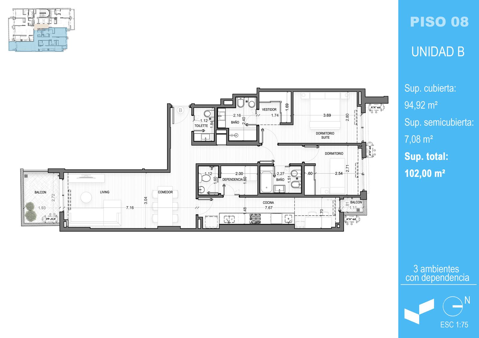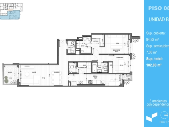 Amplio 3 ambientes con dependencia, balcón al frente y balcón interno. Dos habitaciones en suite, una de ellas con vestidor, placares espejados, toilette y cocina comedor separada.
