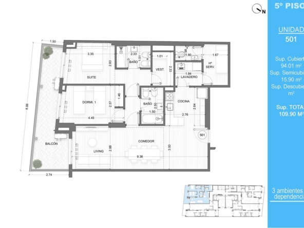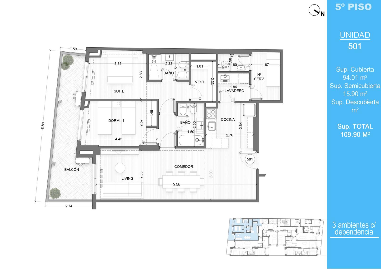 Departamento de tres ambientes con balcón al frente, suite principal con vestidor, cocina integrada a un luminoso living comedor y dependencia de servicio con baño y lavadero. Todos los ambientes tienen salida al balcón, lo que te permite disfrutar de luz natural.