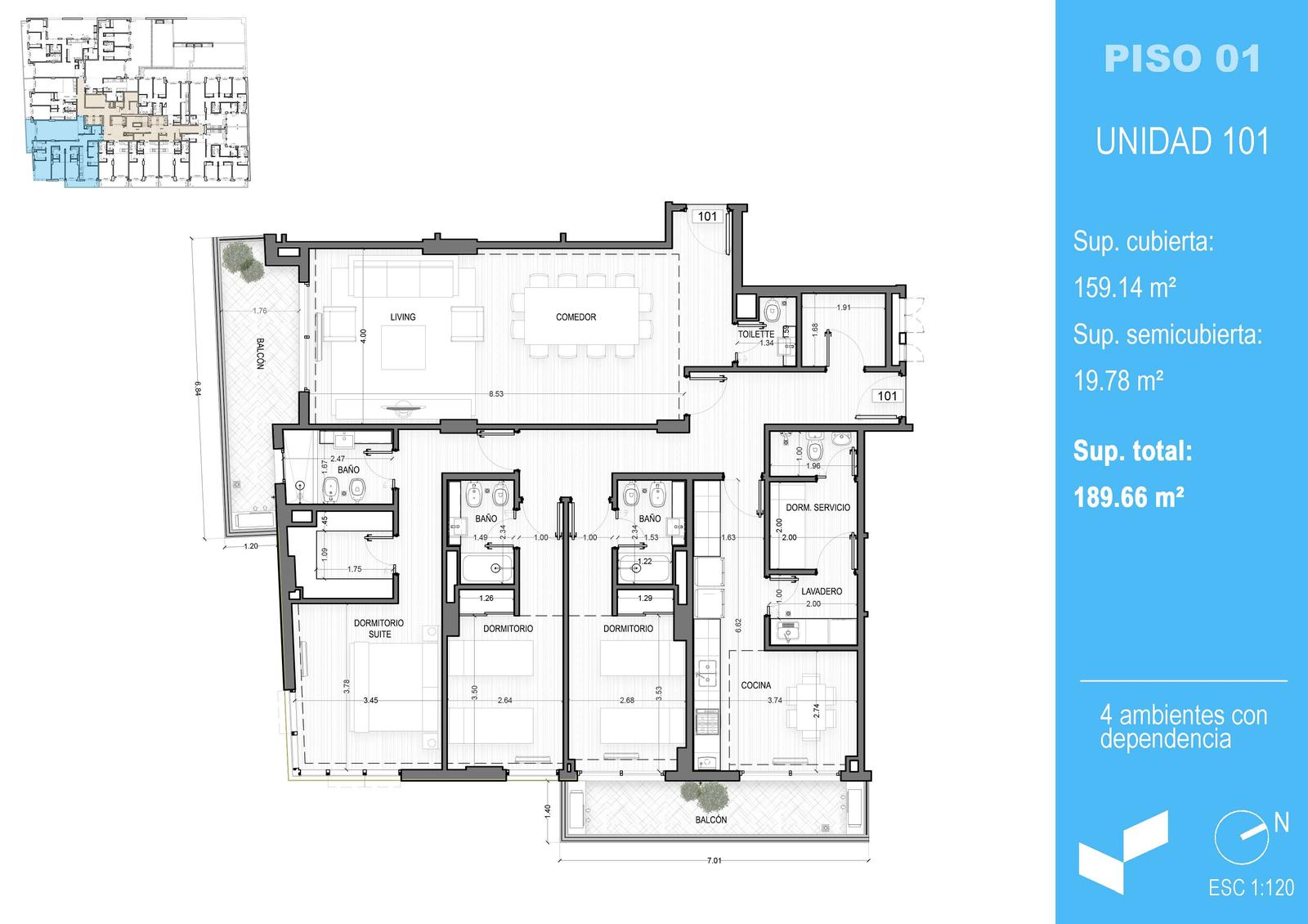 Exclusiva unidad de 4 ambientes con dependencia, diseñada con espacios amplios y funcionales.Se compone de un luminoso living–comedor, cocina independiente con lavadero y dormitorio de servicio.Dispone de tres dormitorios en suite, uno de ellos con vestidor, y un elegante toilette de cortesía.