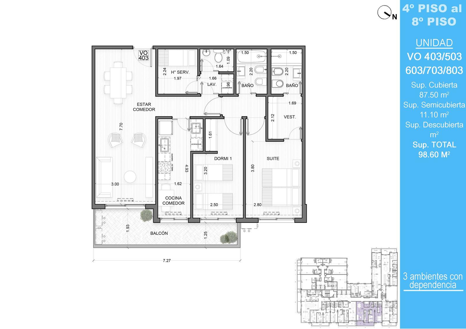 Amplio departamento de 3 ambientes con balcón y un generoso estar comedor. Disfrute de una suite principal con vestidor.Además cuenta con baño completo, cocina comedor independiente, habitación de servicio con baño y lavadero.