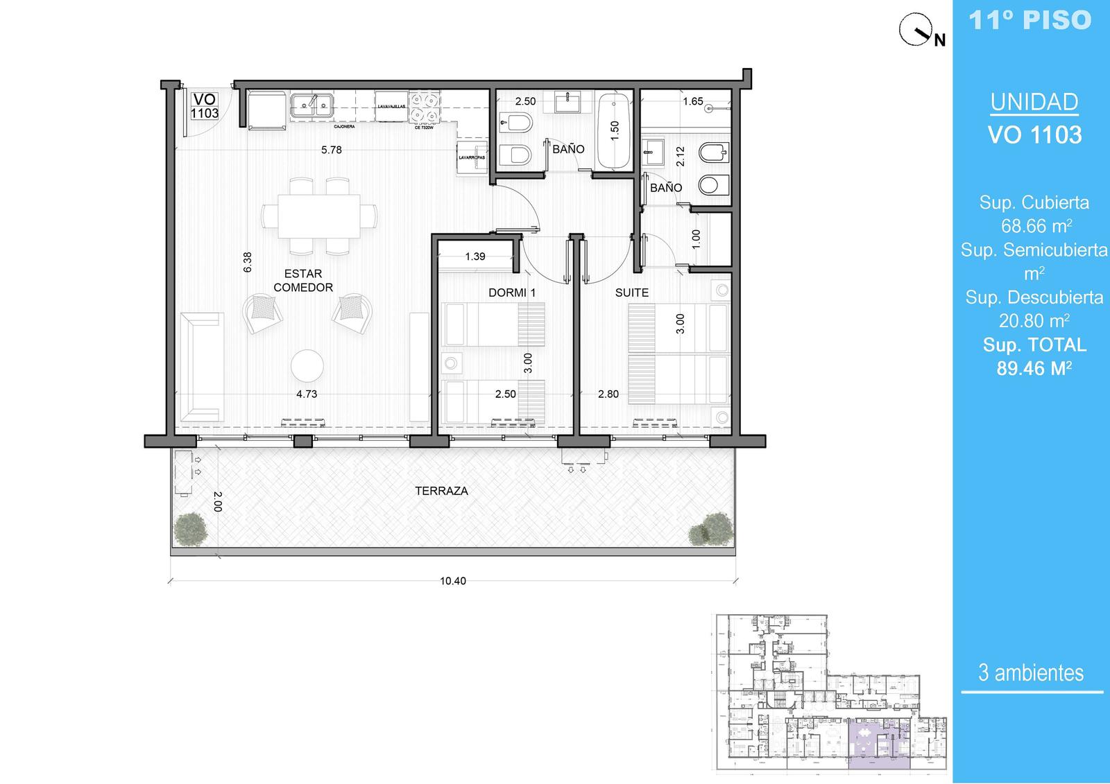Amplio departamento de 3 ambientes con terraza,Estar comedor con cocina integrada y baño completo. Habitación principal en suite.