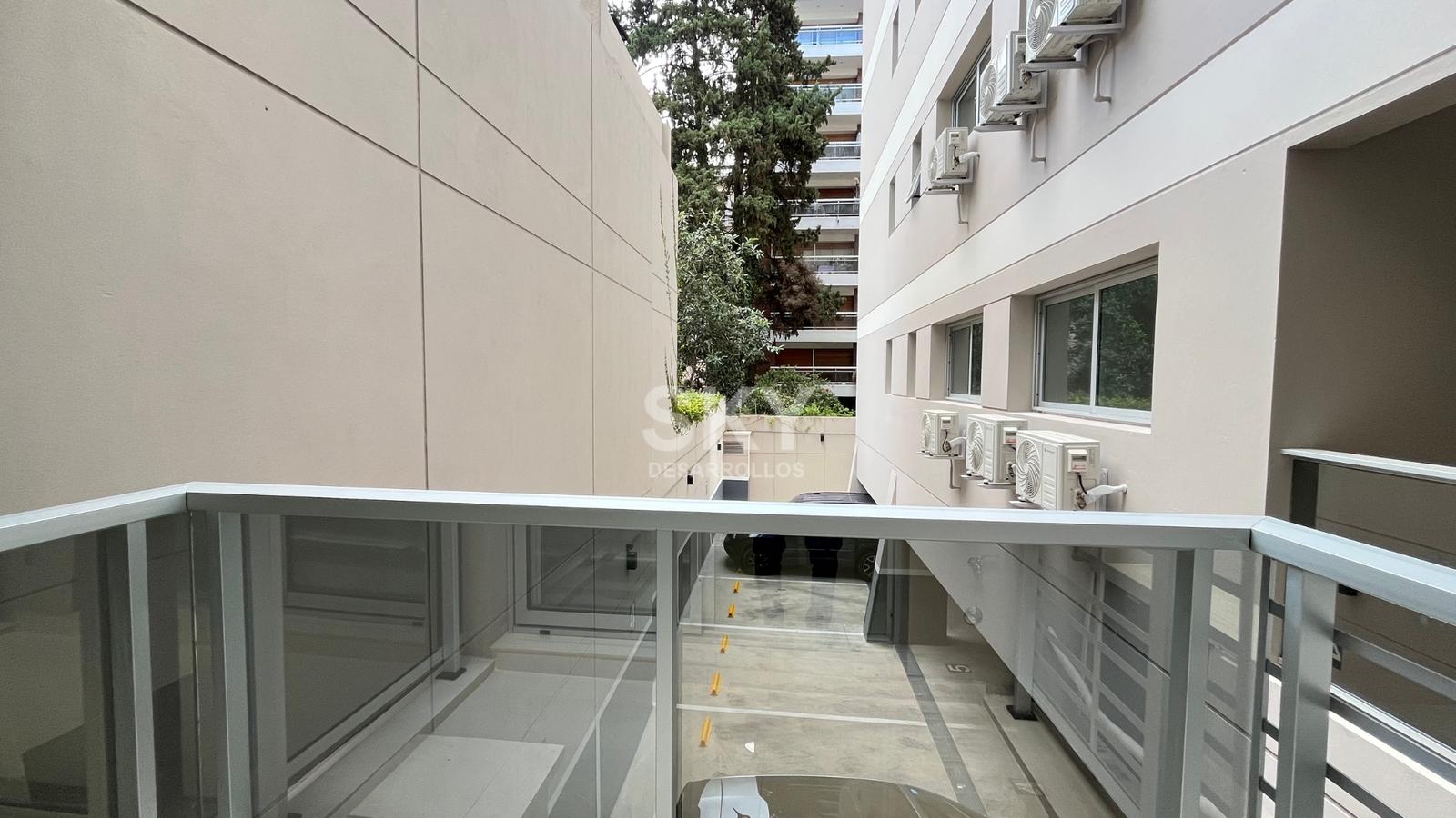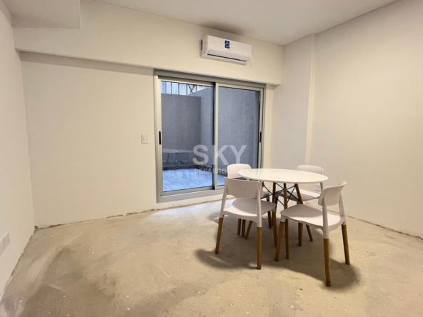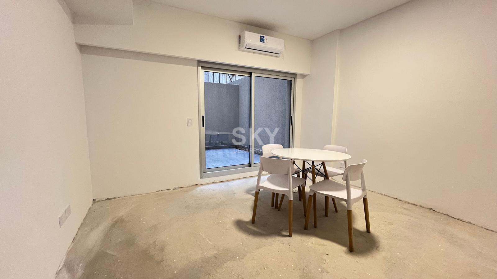 Moderno 2 ambientes con patio y balcón. Habitación con salida al patio, baño completo, cocina integrada con isla y amplio living comedor.