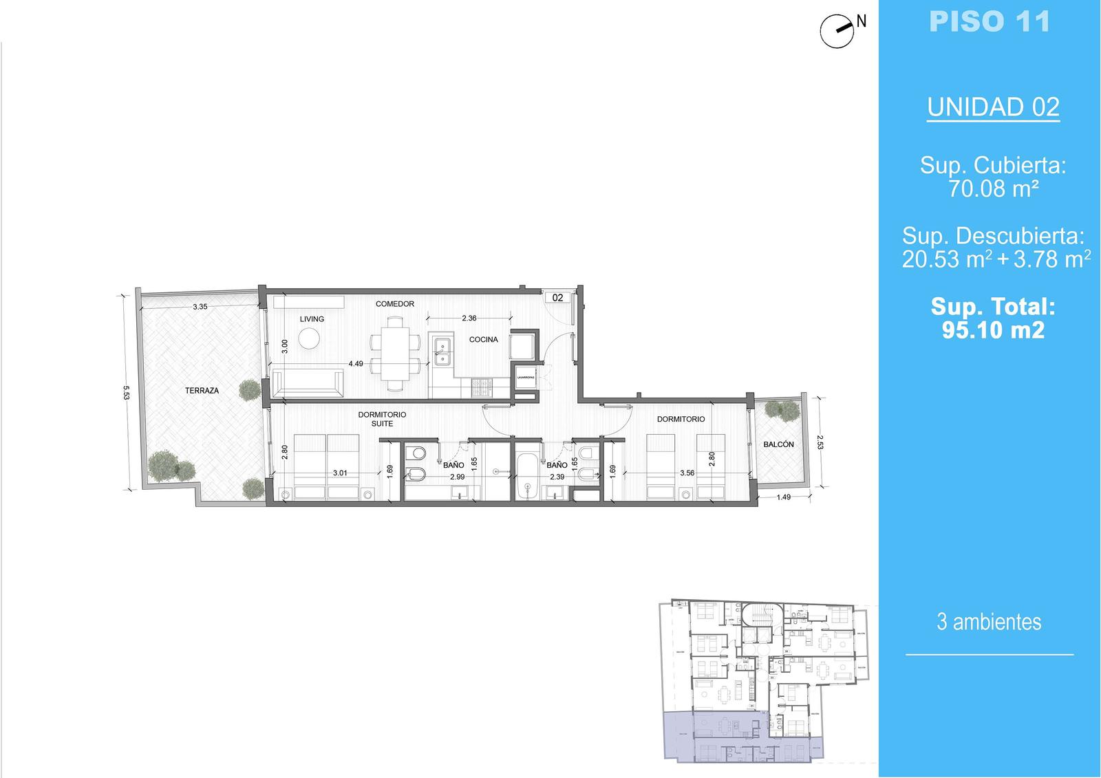Moderno 3 ambientes con balcón aterrazado al frente. Habitación principal en suite con salida a terraza, baño completo, y living comedor con cocina integrada.