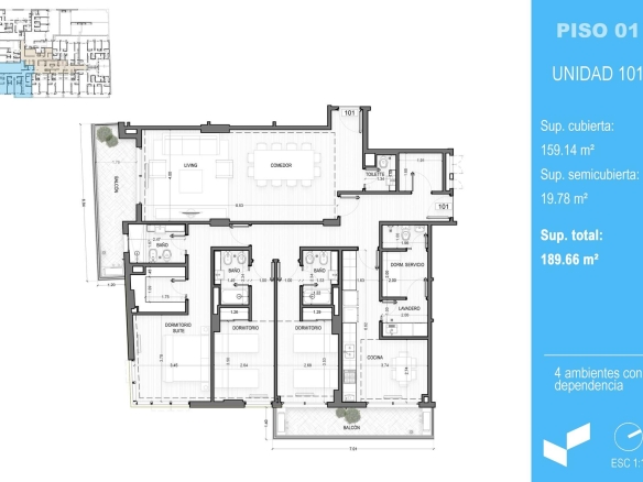 Exclusiva unidad de 4 ambientes con dependencia, diseñada con espacios amplios y funcionales.Se compone de un luminoso living–comedor, cocina independiente con lavadero y dormitorio de servicio.Dispone de tres dormitorios en suite, uno de ellos con vestidor, y un elegante toilette de cortesía.