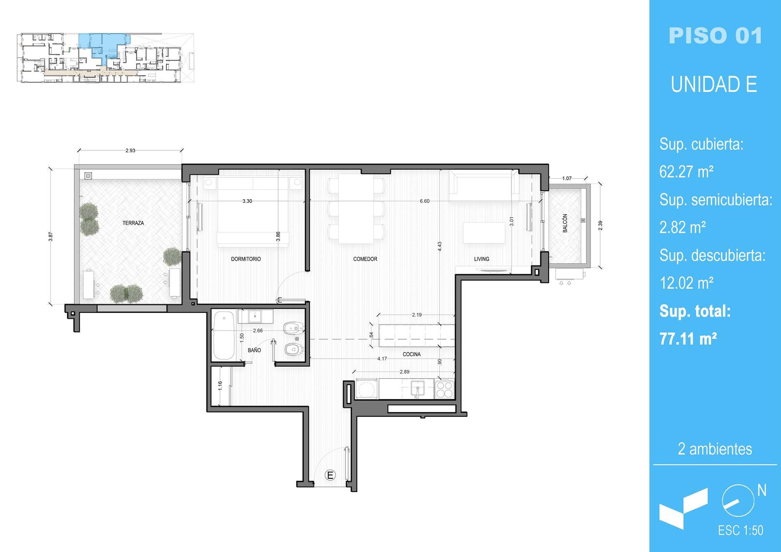 Moderno 2 ambientes con patio y balcón. Habitación con salida al patio, baño completo, cocina integrada con isla y amplio living comedor.