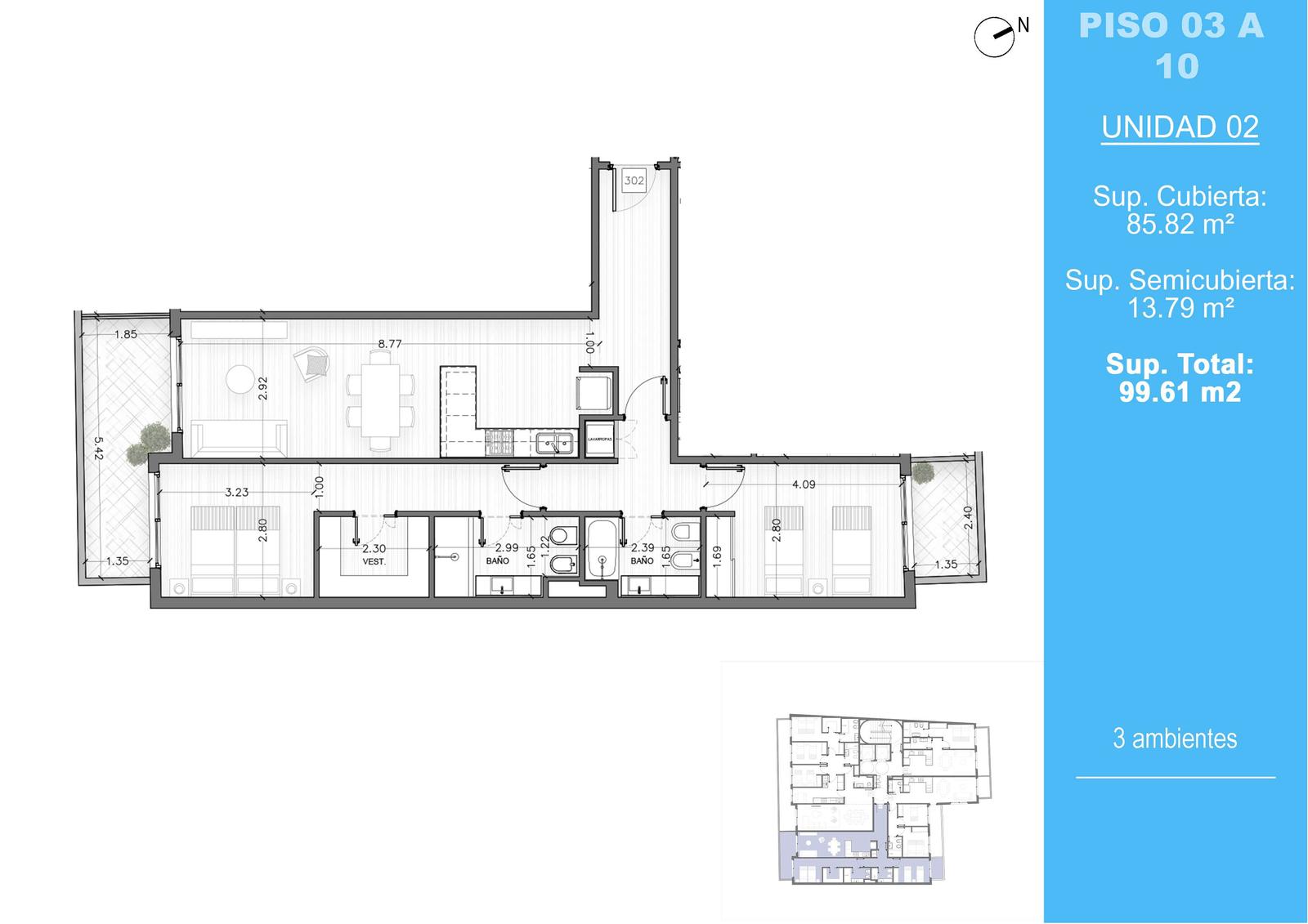Moderno 3 ambientes con balcón. Suite con vestidor, habitación secundaria con salida a balcón, baño completo, living comedor con cocina integrada.