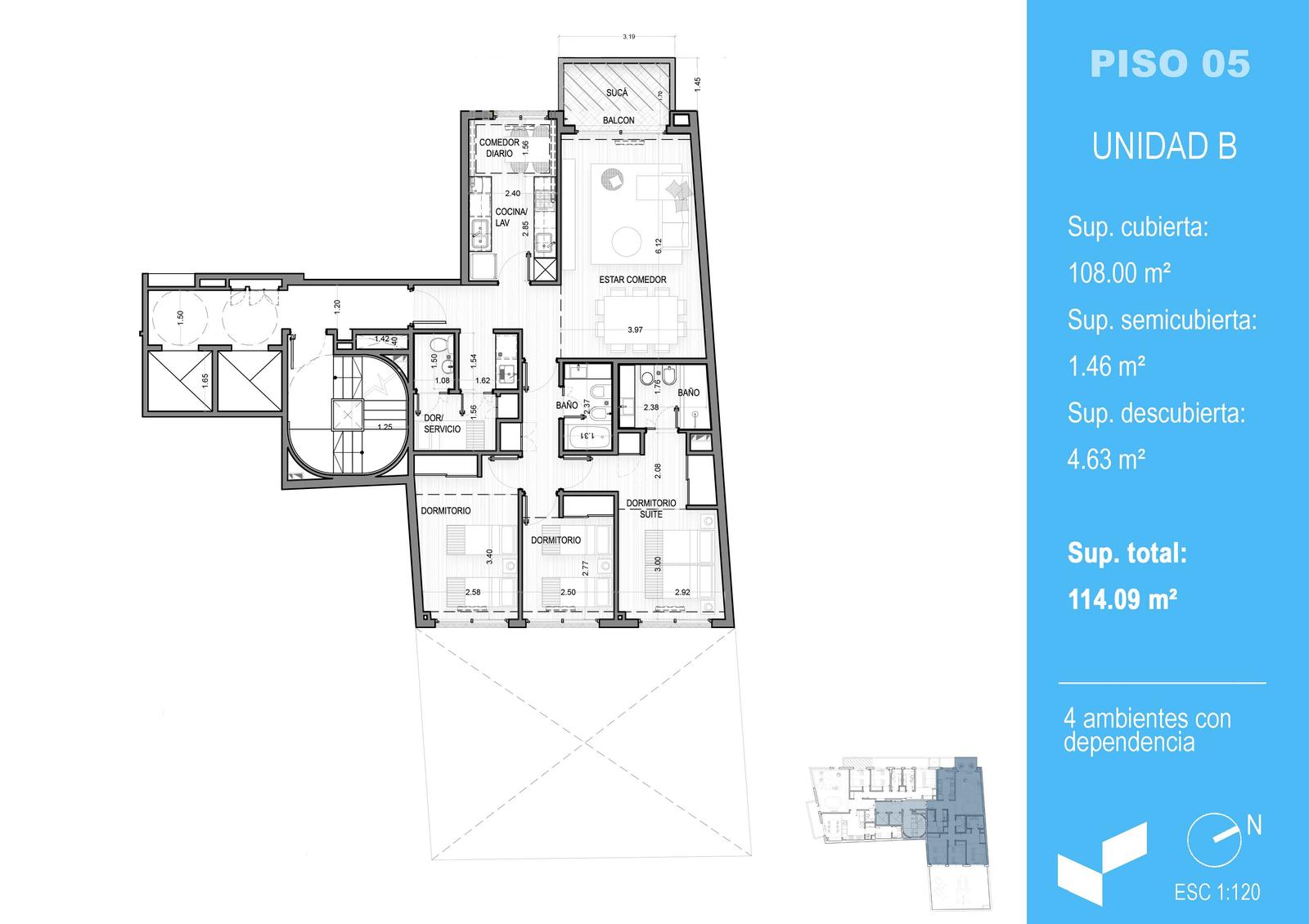 Departamento de 4 ambientes con dependencia.Amplio estar comedor con salida al balcón, cocina independiente con comedor diario y lavadero. Dormitorio principal en suite, dos dormitorios adicionales, baño completo y toilette. Dependencia con baño propio.Funcionalidad, luminosidad y excelente distribución en todos sus ambientes.