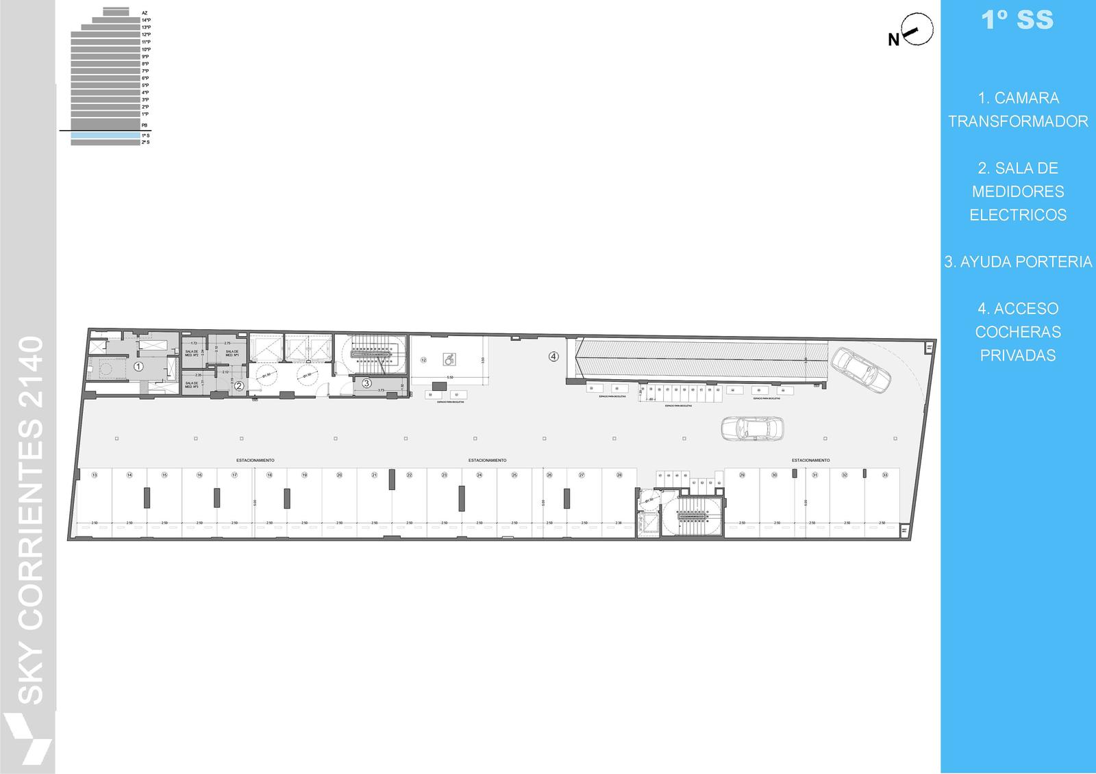 Parking comercial desarrollado en Planta Baja y Primer Subsuelo, con 33 cocheras en total, 2 de ellas adaptadas para personas con discapacidad.